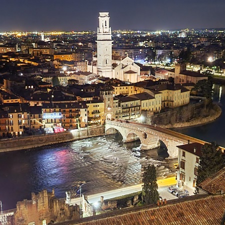 Werona… Ach Werona! Do tego zimą! Cóż to było za ponowne odkrycie! Zaparkowaliśmy w niebywale pięknym miejscu. Kiedy wysiedliśmy z auta i roztoczył się przed nami widok na rozświetloną historyczną część miasta u stóp, oniemieliśmy z zachwytu, a kiedy chwilę później zbiegaliśmy w dół po kamiennych starych schodach, to silne wrażenie uczestniczenia w czymś pięknym jeszcze się wzmogło.
