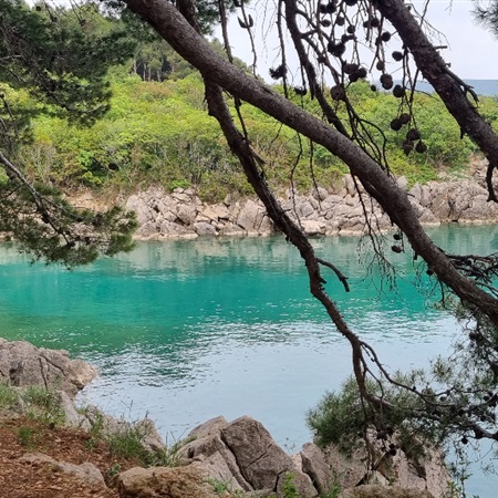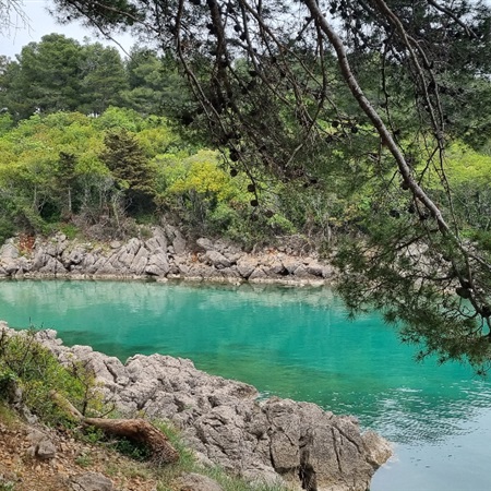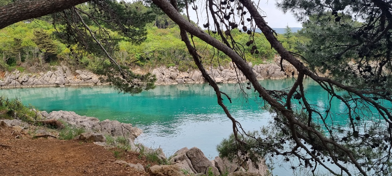 Pamiętam także piękną ścieżkę, na jaką wychodziło się przez tyły naszego kempingu Valamar wprost na skaliste zarośnięte piniami nabrzeże, która prowadziła do centrum miejscowości KRK, 2 kilometry wąską dróżką, pomiędzy kamieniami, bardzo wszak wygodną i prowadzącą przez malownicze turkusowe zatoczki. Kiedy pstryknęłam po drodze zdjęcie jednej z nich i wysłałam do przyjaciółki, była przekonana, że zdjęcie jest sztucznie podkolorowane. Nie było, bo nie było takiej potrzeby.