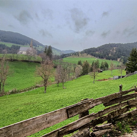 W piątek rano, kiedy pogoda już łamała się, a mokry i chłodny jęzor deszczu dotarł i tam, ruszyliśmy w drogę powrotną. I znowu, kierując się w poszukiwaniach miejscem gdzie nie pada lub gdzie względnie pada najmniej, dojechaliśmy do regionu Val di Funes w Dolomitach, do miejscowości Santa Maddalena.
