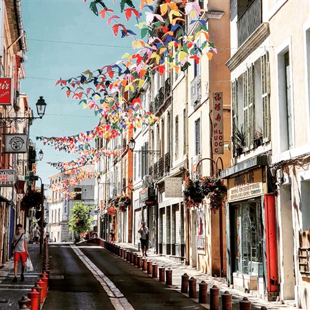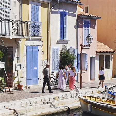 Pierwszy z trzech noclegów spędziliśmy w miejscowości Martigues. To mała i urocza miejscowość, nieznana mi wcześniej. Dotarliśmy do niej późnym wieczorem i był to chyba podczas naszej całej wyprawy ten jedyny raz, kiedy zdecydowaliśmy się spędzić noc na kempingu. Zachęciły nas dobre opisy na aplikacji park4night oraz to, że poza nim naprawdę nie sposób było znaleźć w szczycie sezonu miejsca do zaparkowania w tej popularnej nadmorskiej miejscowości. Sądzę, że wybrany przez nas kemping spełniał wszystkie kryteria takiego miejsca, pomimo tego zdecydowanie uznaliśmy, że jakość przebywania na kempingu ma się nijak do jakości samo bytowania w pięknych okolicznościach przyrody z dala od zgiełku, ludzi, harmidru kojarzonego z dużym obozowiskiem. Właściwie irytowało mnie tam wszystko, pomimo że nie były to jakieś wstrząsające tragedie, a raczej zespół drobnych dokuczliwości i niezrozumiałości. Począwszy od brudnego zatłuszczonego piachu, który rzucił mi się w oczy jako pierwszy, kiedy zaparkowaliśmy we wskazanej pozycji i postawiłam nogi na gruncie. Następnie poprzez długie smutne ogrodzenie całkowicie odgradzające teren kempingu od morza, z którym bezpośrednio sąsiadował, jak i to, że cena płacona przy wyjeździe była zupełnie inna od deklarowanej w cenniku oraz, że nie otrzymaliśmy przy tym normalnego rachunku, tylko jakąś tam zabazgraną kartkę wskazującą na szarą strefę obiegu pieniądza. Na jedyny plus poczytuję wielkość dostępnego węzła sanitarnego, ogromne kabiny prysznicowe i ogólną czystość w nich panującą. Wiem, że są na świecie miłośnicy przebywania w takich miejscach. My na pewno do nich nie należymy. Rankiem otrzepaliśmy się szybko z tego wspomnienia i wyruszyliśmy do nadmorskiego centrum Martigues.