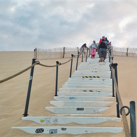 Jechaliśmy na miejsce rowerami, tak długo jak się dało. Ostatni odcinek trzeba jednak pokonać piechotą, a właściwie wspiąć się zasypanymi piachem schodami na szczyt tej gigantycznej zwalistej wydmy. Wysiłek nie jest to jakiś ogromny, za to bardzo opłacalny, ponieważ tuż po osiągnięciu najwyższego punktu widać, jak wydma opada bardzo długim i łagodnym stokiem do oceanu tworząc bardzo spektakularną pochylnię.